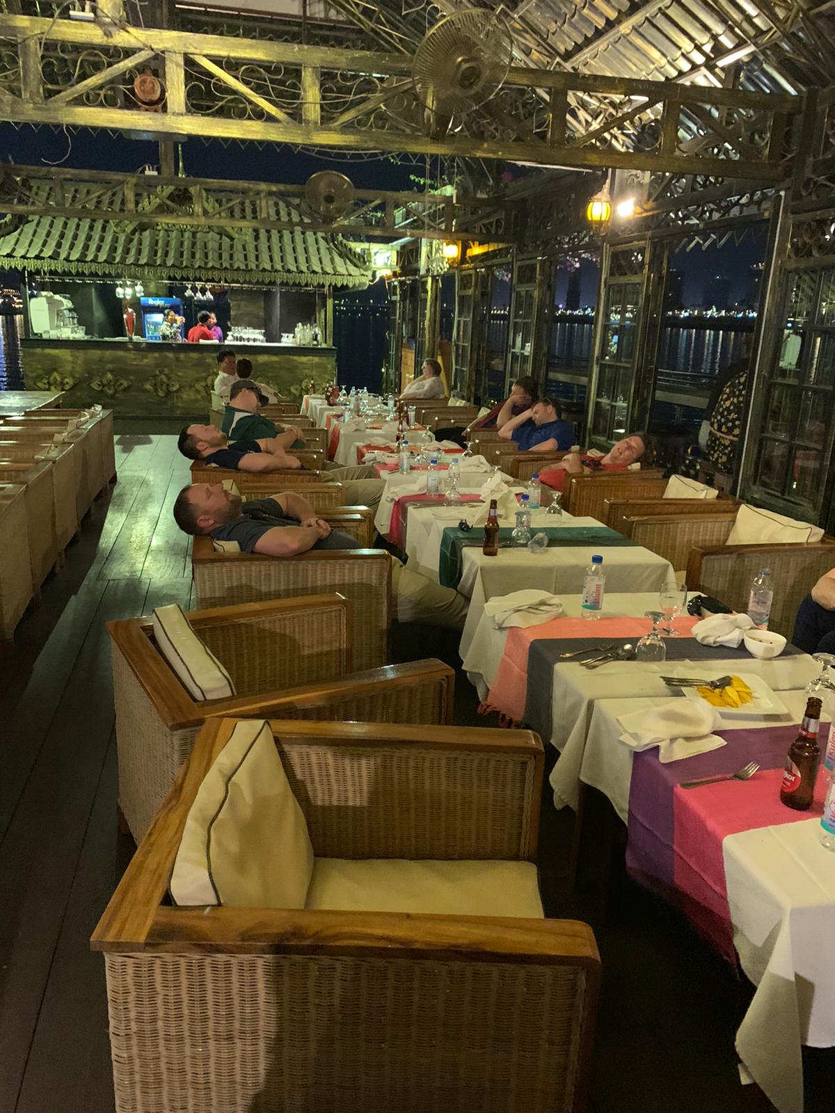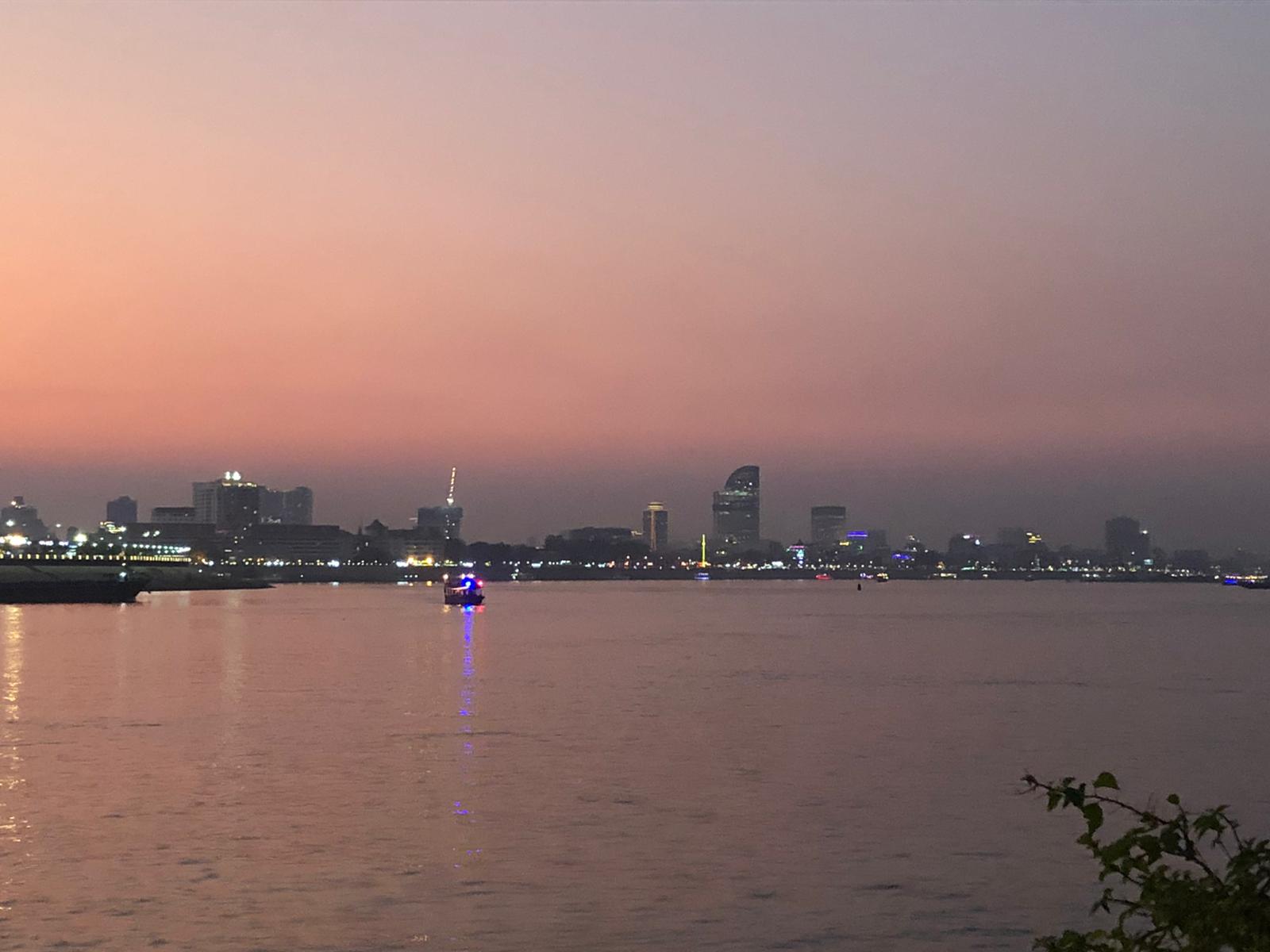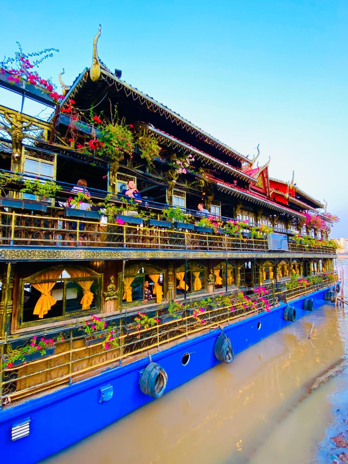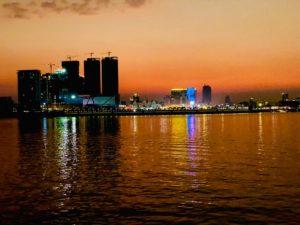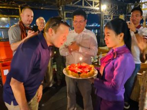 Next we traveled through rush hour again to get to a boat for a river cruise. The boat was beautiful and it was fun to go along the river and see all the different building and architecture. Dinner was delicious and featured over 10 traditional Cambodian dishes and fruits that were too numerous to count. The Phnom Penh skyline is beautiful at night and we could see the various levels of economic development across the city from skyscrapers to primitive housing. We ended the cruise with a celebration of Shane’s birthday!